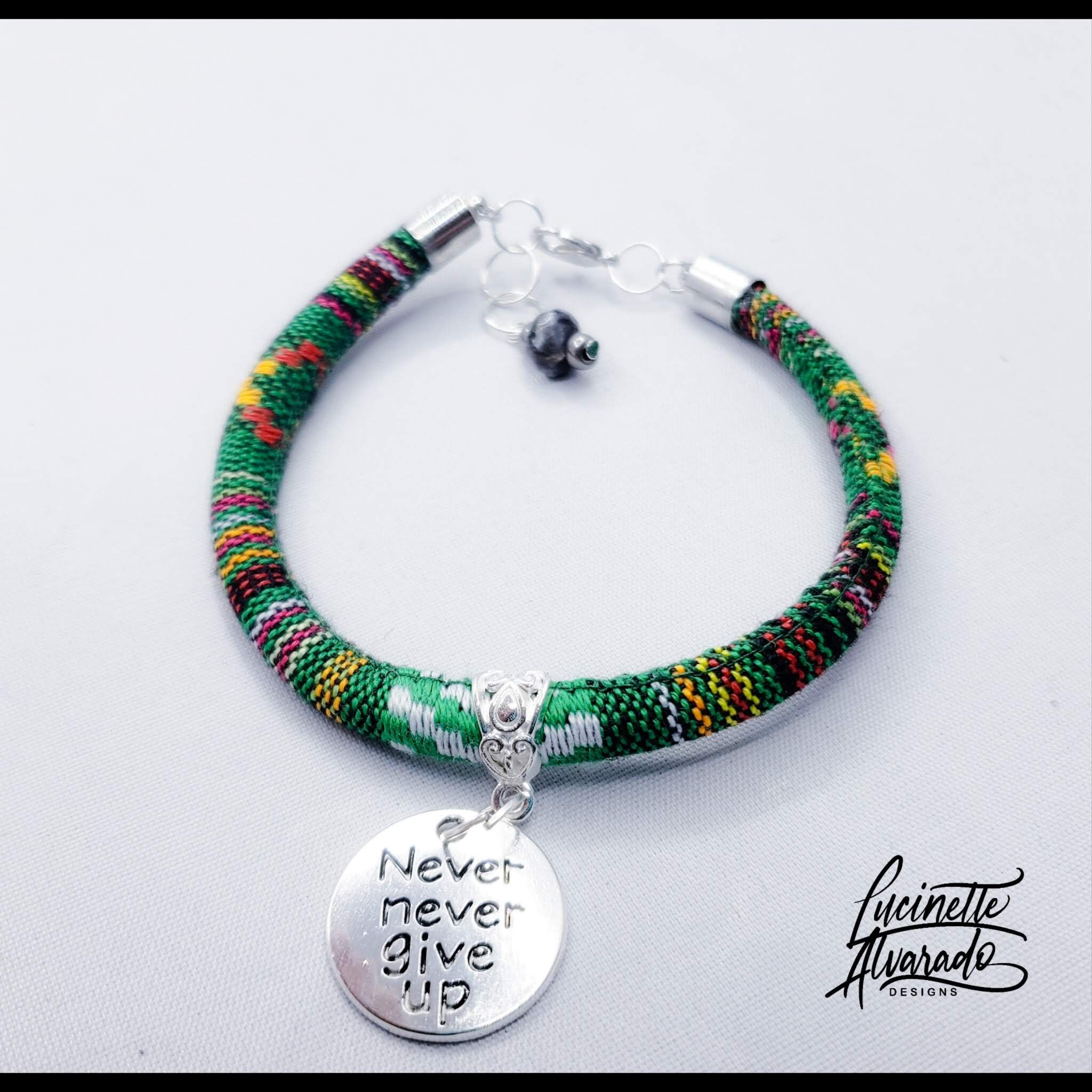 This is a versatile bracelet that you can wear with everything throughout the year. A beautiful fabric cord bracelet with a inspiring silver charm. The width is 7 inches but has an extension of approximately 1 inch.